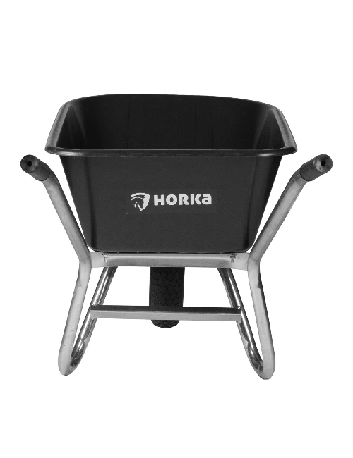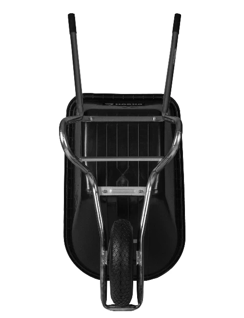 Þungavinnuhjólbörur með plastbakka, húðuðum ramma og lekavörn. Traustar, stöðugar og góðar hjólbörur í hvaða verk sem er.